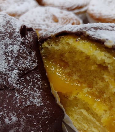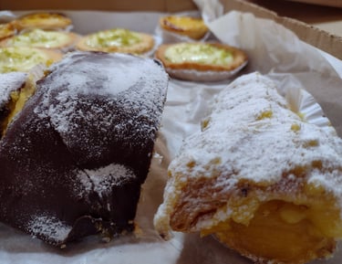 Folhado crocante com recheio de creme português ou chocolate, perfeito para quem ama texturas e sabores contrastantes.